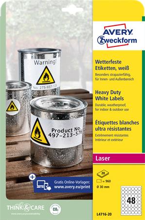 Etikett, kör, 30 mm, poliészter, időjárásálló, AVERY ZWECKFORM, fehér, 960 etikett/csomag